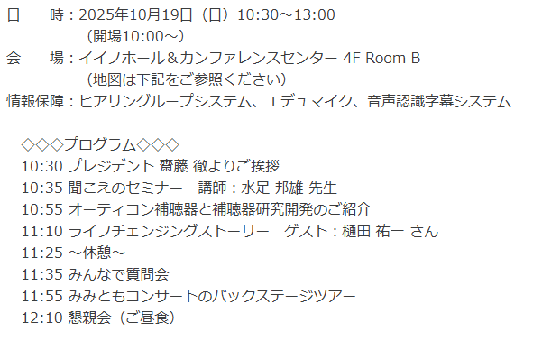 内容も素晴らしいですし難聴の当事者やそのご家族、一般の方に幅広く参加して欲しい会です。